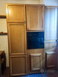Cucina in legno massiccio di mt. 6.00 divisa in tre parti (come da foto) con una altezza di mt. 2.50 comprensiva di top in granito, lavastoviglie Whirpool, forno Whirpool, frigo Whirpool, fornelli Franke e tavolo in legno da 6 posti con rispettive sedie. Smontaggio e trasporto a carico dell'acquirente