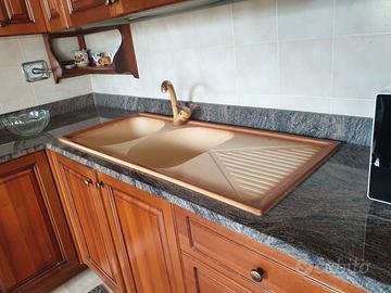Mobili per cucina angolare cm 243x60 e 290x60 comprensiva di Frigorifero ad incasso, piano cottura, cappa, forno e lavello, top in granito + tavolo rettangolare e quattro sedie. Smontaggio e trasporto a carico del compratore