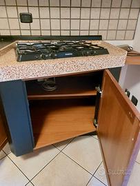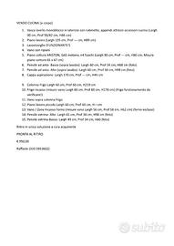 VENDO CUCINA (a corpo) 1.Vasca lavello monoblocco in laterizio con rubinetto, appendi attrezzi-accessori cucina (Largh 90 cm, Prof 58/82 cm, H86 cm) 2.Piano lavoro (Largh 105 cm, Prof --- cm, H89 cm) 3.Lavastoviglie (FUNZIONANTE!) 4.Vano con ripiani 5.Piano cottura ARISTON, GAS metano, n4 fuochi (Largh 80 cm, Prof --- cm, H86 cm; Misura piano cottura 65 x 47 cm) 6.Pensile ad anta- Basso (sopra lavabo): Largh 60 cm, Prof 34 cm, H68 cm (foto) 7.Pensile ad anta- Alto (sopra lavabo): Largh 60 cm, Prof 34 cm, H98 cm (foto) 8.Cappa aspirazione: Largh 170 cm, Prof --- cm, H45 cm 9.Colonna frigo Largh 60 cm, Prof 60 cm, H219 cm 10.Frigo incasso (misure vano Largh 60 cm, Prof 60 cm, H178 cm) (frigo funzionamento da verificare!) 11.Vano sopra colonna frigo 12.Piano lavoro piccolo Largh 60 cm, Prof 60 cm, H—cm 13.Vano / Zona Incasso Forno (misure vano Largh 56 cm, Prof 58 cm, H62 cm) (forno escluso) 14.Pensile vetrina- Alto: Largh 45 cm, Prof 34 cm, H98 cm (foto) 15.Pensile vetrina-Basso: Largh 49 cm, Prof 34 cm, H60 (foto) Ritiro in unica soluzione a cura acquirente PRONTA AL RITIRO € 950,00 Raffaele (333 5953602)
