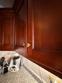 La cucina è stata mantenuta con cura, il legno è in ottime condizioni e le cerniere sono perfettamente integre. Offre una capacità di stoccaggio superiore alla media grazie ai pensili alti e ai numerosi cassetti.