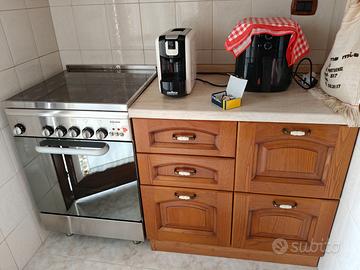 Cucina in legno colore miele composta da una base lavello da cm 120 con lavandino in acciaio, scolapiatti/pensile da cm 120 di larghezza per 106 di altezza, una base da cm ,90 con 2 sportelli, una base da 90 con cestelli e cassetti più un pensile a due ante da cm 90 di larghezza e cm 106 di altezza e una cappa con aspiratore da cm. 60. Possibilità di acquistare a parte la macchina del gas in acciaio.
