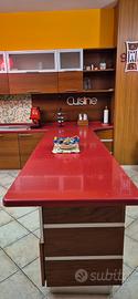 cucina in legno teak con piano okite rosso compreso di 4 sgabelli , smontaggio e trasporto a carico di chi acquista , prezzo trattabile lunghezza:340+122 dall'inizio snack larghezza snack 79