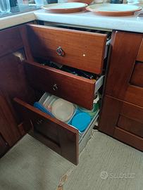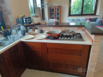 cucina in legno composta da 1 pensile con vetro da 45 cm, due pensili da 60 cmX30 di profondità, 3 basi da 60cm , 3 basi da 45, una base da 90 cm una base con 3 cassetti da 45, due cassoni da 90cm, un carrello da 15, con lavabo doppia vasca e sgocciolatoio da 116 cm, gas Ariston 5 fuochi da 75 cm, incasso da forno ad altezza 84 .