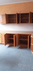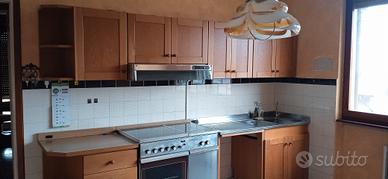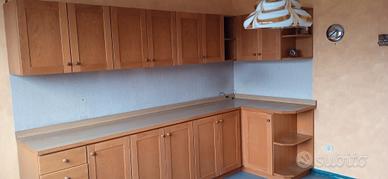 cucina in legno massiccio formata da due zone : la prima è composta da mobiletti bassi + pensili che formano un angolo ( lunghezza 250cm + 130 cm) con ripiano in legno (altezza ripiano 91cm, altezza pensili 61cm); la seconda zona con lavandino in acciaio 2 vasche + scolapiatti , vano lavastoviglie, forno e piano cottura, cappa + cassettiera e pensili ( lunghezza totale 300cm).