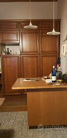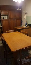 cucina angolare in legno con penisola tavolo e 6 sedie. È fornita di frigorifero, forno, lavastoviglie, lavello a doppia vasca e vano per il microonde.