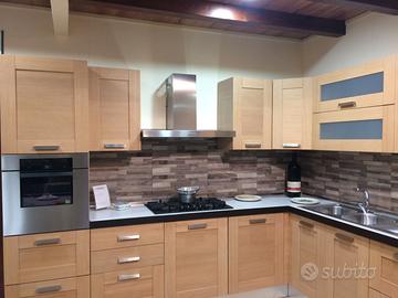 Cucina moderna con anta a telaio, finitura rovere naturale, completa di piano cottura 5 fuochi a gas, frigo-freezer 320 lt, forno multifunzione, lavastoviglie da 60 cm.