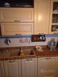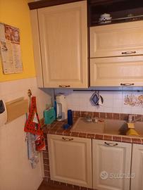 Cucina in muratura smontabile, completa di forno, piano cottura, frigorifero, lavastoviglie, cappa aspirazione, dimensioni 3440 x 600 x h 2400 lato sinistro, dimensioni 2600 x 600 x h 2400 lato destro, dimensioni cappa h 2750, tavolo rotondo diametro 1060 completo di 4 sedie.