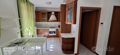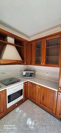 Cucina con sportelli in noce, misure 266 cm x 287 cm, profondità 60 cm. Cappa, frigo e forno funzionanti. Tavolo 80 x 80 e 2 sedie. Smontaggio e trasporto a carico dell'acquirente.