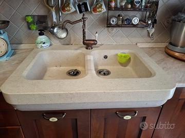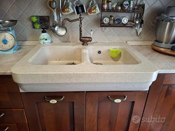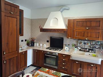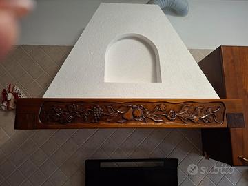 Cucina in noce con cappa in trave lavorato in massello,lavello ricavato da pieno in pietra, lavorazione bucciardata,frigo, piano cottura , cappa, lavandino con miscelatore No Forno. Smontaggio e ritiro a carico costro