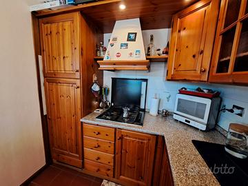 Vendo cucina in pino massello ad angolo, con frigo e cella freezer, piano cottura a gas, cappa, lavello a 2 vasche, con faretti, ben tenuta.