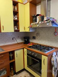 Cucina in stile moderno, tipologia di legno ciliegio, in buono stato. Area riservata al montaggio della cucina: larghezza cm.270 , profondità cm.150. I pensili superiori sono in altezza cm.90. Il piano cottura è compreso nella cucina. Sono esclusi il frigorifero e il forno elettrico. In buono stato.