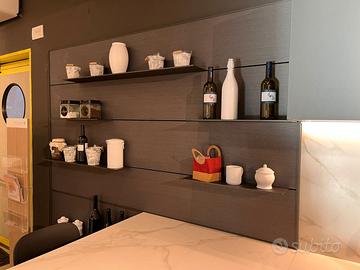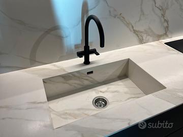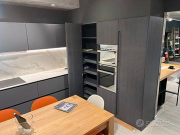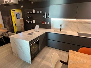 Cucina Moderna in vetro grigio Foca, con top in gres porcellanato effetto venato Calacatta con integrato lavello scatolato e saldato in gres, colonne in impiallacciato rovere con effetto cannettato. La cucina ha una lunghezza totale di 636 cm compreso lo spessore delle colonne ad angolo, dove troviamo spazio per frigo, forno e microonde, inoltre la colonna angolo è attrezzata con un sistema di estraibili. Il Top della cucina in Gres Porcellanato con profondità cm 70 e schienale alto 68cm, ha una dimensione totale di 465cm compresa la profondità della zona snack sulla parte sinistra della cucina con una penisola di 195cm. Le colonne hanno ante in legno impiallacciato rovere con finitura cannettata, con altezza 216cm, mentre i pensili in vetro sono alti 60cm con apertura Vasistas motorizzata automatica. La composizione così come è presentata non ha uno spazio dedicato alla lavastoviglie, ma può essere inserita al posto della zona cantinetta a vista inserendo una anta in finitura. Prezzo della composizione da definirsi esclusi gli elettrodomestici e accessori, con la possibilità di acquistarli con prezzo da concordare. Preferibile contatto telefonico al numero presente nell'annuncio