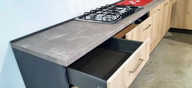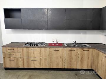 Cucina NUOVA di esposizione 304x 364 mt lato lavello. Si può anche cambiare la disposizione degli elementi poiché compreso nel prezzo c’è un top in laminato NUOVO ancora da tagliare e modificare in base alle vostre misure.