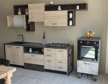 Cucina in stile industriale completa di elettrodomestici smeg (forno e piano cottura), lavello in resina plados e cappa integrata.