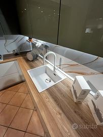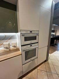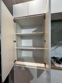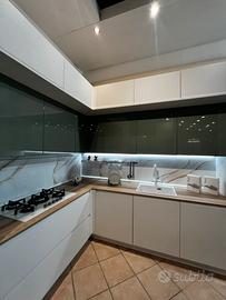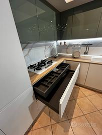 Sma emporio casa offre una cucina molto richiesta !! Modello Joy : - L. 3.70 H. 2.52 P. 64 (lato lungo ) - L. 2.80 (lato corto) - Cucina con sopralzi H.36 per il doppio del contenimento - Elettrodomestici whirpool total white comporti da : piano cottura 5 fuochi in vetro bianco , forno e microonde multifunzione bianchi , lavastoviglie l.60 e frigorifero l.60 - lavello franke in fragranite bianco con miscelatore con doccina estraibile - pensili verde timo lucido - colonne e basi bianco opaco - maniglia incorporata nel frontale della cucina - colonna L.90 adibita a dispensa - base ad angolo con accessorio estraibile CUCINA VISIONABILE IN SEDE A CALVATONE PER INFO CONTATTATECI AL 037597677