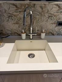 Cucina marca Comprex laccata interna e esterna con piano in corian miscelatore con doccetta, lavello a filo, piano cottura whirpool 5 fuochi e piastre in ghisa incluso nel prezzo € 800 lunghezza 3mt vendo senza elettrodomestici .