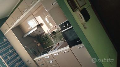 Cucina laccata Verde salvia lunghezza 280 cm, altezza 240 cm, con i seguenti elettrodomestici: forno Bosch, lavastoviglie Bosch, piano cottura a gas.