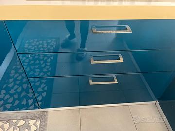 Cucina laminato Artec con piano in laminato con penisola, misure 288x300x190 completa di cappa estetica Elica filtrante, piano cottura gas Bosh da 90, doppia vasca Franke con miscelatore con doccetta estraibile, verde petrolio lucido, alcuni segni di usura sulla vernice, fascia zoccolo sotto la lavastoviglie rovinata da sitemare.