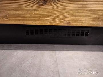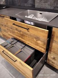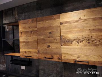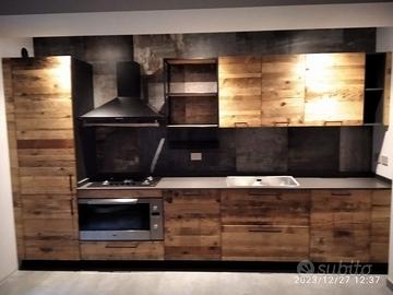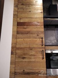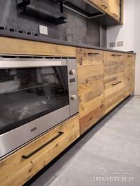 cucina costruita con scocca in laminato NERO OPACO (interno trucciolare riciclato legno di buona qualità) mentre esterno ante e frontali cassetto saranno costruiti a 3 strati (interno multistrato esterno con cartelle in legno vecchio recuperato) con venatura orizzontale a livelli sfalsati (con tonalità diverse) non venatura continuativa.