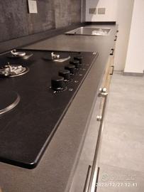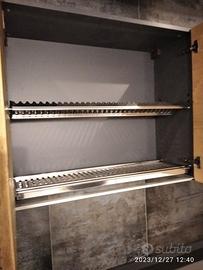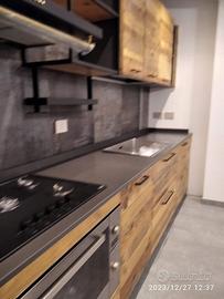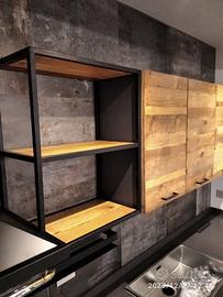 vs cappa. pensile in ferro h 85 prof. 35 larghezza 60 costruito in tubolare 20 x 20mm disposto tutto a giorno con 3 ripiani fissi in legno vecchio verniciato a polvere struttura di ferro nero opaco, con applicato sotto porta spezie in ferro. pensile da 90 scolapiatti h 85 prof. 35 interno scolapiatti. pensile da 60 con 1 anta ripiano interno e apertura anta (appena sotto trave). pensile a giorno da 20 cm circa con fascia tamponamento. ELETTRODOMESTICI ESCLUSI. maniglia squadrata nero opaco. cerniere e guide regolabili ammortizzate in chiusura e cassetti sponde metalliche nero opaco, scanso per tubi e vasca. 4 cesti di spazzatura, fondo in alluminio anti goccia, fondo in plastica frigo e griglia per aria h 12 cm, piedini livellatori, pensile scolapiatti e porta bicchieri, attaccaglie posteriore. Schienale posteriore 8 mm. Finitura effetto grezzo naturale trasparente e polvere sul ferro. TOP silestone marengo spessore 2 cm suede nero lunghezza 326 profondo 62 smussato angoli e alzatina h 5 cm spessore 2 completo di traforatura per lavello e piano cottura. Compreso finitura Iva non comprendente, costruito su commissione, non disponibile a magazzino ma possiamo riprodurlo DIRETTAMENTE DAL PRODUTTORE ASTENERSI RIVENDITORI O COMMERCIANTI