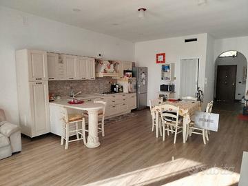 Cucina con sportelli in legno massello, beige. Non include elettrodomestici, tavolo, sedie, sgabelli e colonna sotto la penisola. Vista e piaciuta.