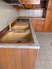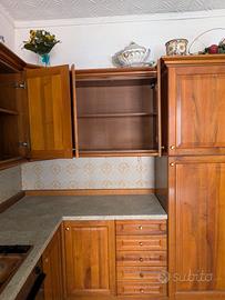 Cucina con soluzione angolare colore ciliegio, provvista di elettrodomestici non testati, non utilizzata da tempo Usata in buone condizioni, provvista vano piatti, dispensa, scaffali e carrelli girevoli soluzione d'angolo. Piano colore antracite impiallacciato, cmq sostituibile. Piano fornelli gas. Forno e frigo compresi non testati. A carico acquirente smontaggio e asporto.