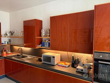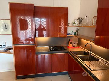 Cucina in legno massello laccato lucido completa di elettrodomestici funzionanti. Altezza 230 cm Lunghezza a "L" 520+190 cm Incluso lavastoviglie nuova, forno, piano cottura, frigor e freezer alto. Escluso quanto appoggiato sul top e sulle mensole