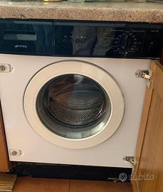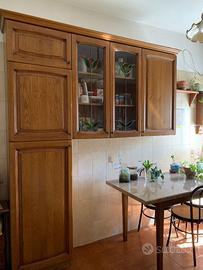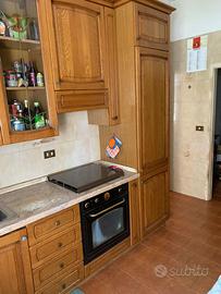 Cucina in Legno Massello, Dispensa, Tavolo ed Elettrodomestici (Lavatrice Smeg, Forno, Piano cottura) Dimensioni: Cucina a L: Lato lungo 302 cm x Lato corto 150 cm. Altezza totale: 252 cm. Blocco Dispensa (frontale): Lunghezza 210 cm x Profondità 35 cm. Tavolo: 140 cm (lunghezza) x 80 cm (larghezza) x 80 cm (altezza). Vendo splendida cucina angolare in legno massello, robusta e dal design classico intramontabile. La struttura è solida e in ottime condizioni generali, ideale per chi cerca qualità e materiali naturali. Composizione e Dettagli: Materiale: Legno massello con calde venature a vista. Elementi di pregio: Pensile vetrina con bellissime decorazioni artistiche sul vetro. Zona Lavaggio: Lavello a doppia vasca in acciaio inox con sgocciolatoio. Elettrodomestici inclusi: Lavatrice a incasso SMEG (mod. LBA60 NE): Modello vintage/datato ma perfettamente funzionante e affidabile. Piano cottura: 4 fuochi perfettamente integrato. Forno: Inserito nella struttura, funzionante (necessita solo di una piccola revisione al termostato). Moduli extra: Struttura a colonna predisposta per l'inserimento di un frigorifero a incasso (frigorifero non incluso). Tavolo: Incluso tavolo molto robusto coordinato con lo stile della cucina. Stato dell'oggetto: La cucina è in ottime condizioni estetiche e strutturali. Segnalo solo la necessità di registrare o sistemare alcune ante, un'operazione semplice che la renderà perfetta. Nota: Smontaggio e trasporto a carico dell'acquirente. Contattatemi per ulteriori foto o per vederla di persona!