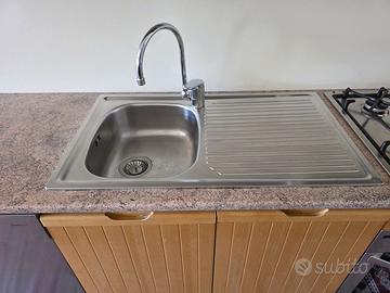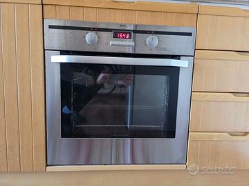 Vendesi cucina lineare (lunghezza totale 285 cm) con ante in legno a doghe verticali e top finitura granito. Soluzione solida e ben mantenuta Dimensioni dettagliate: Ingombro totale: L 285 cm Basi: Altezza piano lavoro 86,5 cm, profondità 58 cm Pensili: Altezza 97 cm, profondità 32 cm. Dettaglio ante: Pensili grandi (sopra cappa e lavastoviglie) 59,5 cm; pensili sopra lavello, base lavello e vetrina 44,5 cm; ante terminali sinistra 24 cm. Cassettiera: Larghezza esterna 44,5 cm (interna utile 36 cm). Elettrodomestici Inclusi (Tutti funzionanti) Lavastoviglie Bosch HydroStar: Modello a incasso con frontalino inox (59,5x71 cm). Forno AEG Competence: Elettrico multifunzione inox (60x60 cm). Piano Cottura AEG: 4 fuochi in acciaio inox (58x50 cm). Zona Lavaggio: Unità completa inox (86x50 cm) con vasca singola (34x40 cm), gocciolatoio e miscelatore. Cappa: Integrata nel pensile. Disponibilità: Fine maggio 2026. Smontaggio: da concordare Logistica: L'appartamento si trova al primo piano con ascensore. Trasporto a carico dell'acquirente. Prezzo leggermente trattabile