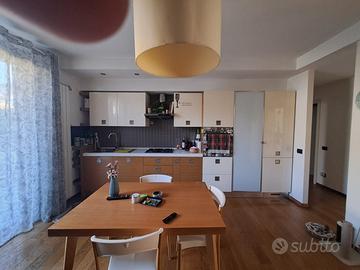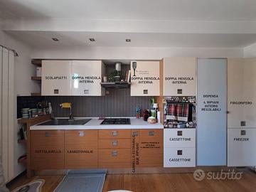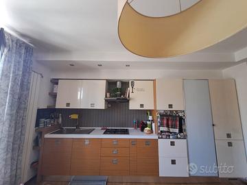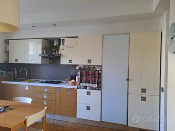 Vendesi cucina Gicinque lineare 440cm totali, come da foto. Materiale laccato nella parte superiore, effetto legno parte inferiore. Altezza totale 218cm (14cm zoccolino). Profondità frigorifero, dispensa, colonna forno = 59cm. Profondità pensili = 37cm. Spessore ante e cassetti 20mm. TOP spessore 60mm. Schienale non disponibile in quanto composto da piastrelle. Elettrodomestici Zanussi funzionanti. Lavello Pyramis. Vendesi per rinnovo arredamento. Smontaggio e trasporto a carico dell'acquirente. A disposizione in caso servissero ulteriori immagini di dettaglio.