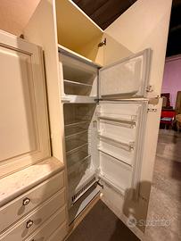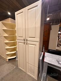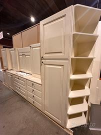 Cucina lineare beige stile country con maniglie in ceramica e cassetti con chiusura rallentata e dispensa completa di: