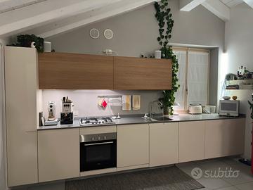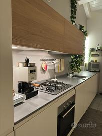 -cucina lineare con rivestimento laccato bianco caldo, pensili in rovere naturale e piano di pregio in quarzite. Fornello, forno e lavastoviglie Siemens. Larghezza circa 4.5 metri. (valore nuovo c.ca 10.000€, piccoli difetti estetici della laccatura, vendo a 3500€)