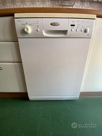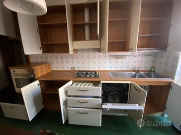 Piano di lavoro in legno, con lavastoviglie da incasso, piano cottura a gas e lavello in acciaio.