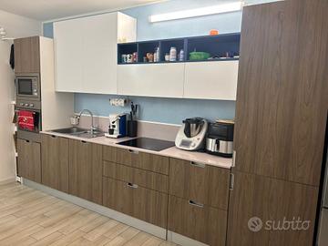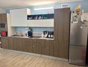 vendo cucina lineare doimocucine come da foto, con forno, microonde, frigorifero esterno e piano cottura a 4 fuochi tutto funzionante , piano in quarzo, più lavastoviglie da sistemare ( non scarica l acqua). vendo per inutilizzo. smontaggio e trasporto a carico dell' acquirente. il prezzo è leggermente trattabile. la cucina è lunga 3,90 metri ( 60 cm il frigo)