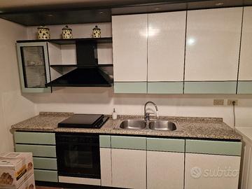 cucina lineare con ripiano in granito, cappa aspirante, forno e faretti per illuminazione. Pensili alti.