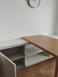 Penisola in rovere con mobili contenitori laccati bianco (tavolo 70x110cm, mobili lunghezza 205cm).