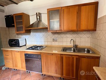 Cucina lineare di 3,6 metri circa (attualmente il frigorifero e’ separato) piu’ mobiletto 60*35 cm realizzata in legno. Cappa acciaio inox fornelli e forno smeg, e frigorifero funzionanti. Compreso anche un fornetto elettrico .