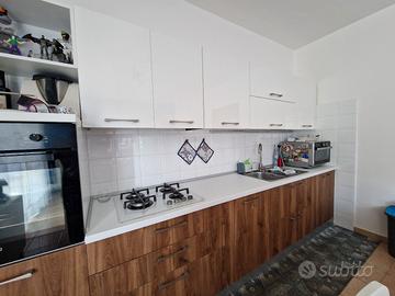 La cucina si compone di due colonne (una frigo ed una con forno), cassettiera, lavastoviglie, lavabo e cassettiera sottostante, anta vuota adoperata come alloggiamento lavatrice, più ulteriore sportello sostitutivo mai adoperato.