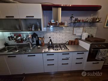 Cucina di lunghezza di 5, 30 mt, bianco lucido con righe orizzontali. Fabbricata nel 2006, in buone condizioni, con soli 2 sportelli leggermente rovinati lato terra. 5 fuochi e forno Franke in un modulo dedicato. Top in quarzo, di colore grigio, ottimo stato.