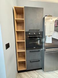 Cucina su minsura lineare (215cm x 60cm)con doppio lavabo antigraffio in fragranite Franke, top in quarzo, piano cottura a gas a 4 fuochi Franke, lavastoviglie integrata hotpoint, cassettiera portaposate con 2 cassetti e un cassettone. Staccata colonna forno Franke con 2 cassettoni(60cmx60cm) e vani a giorno (30cmx30cm).