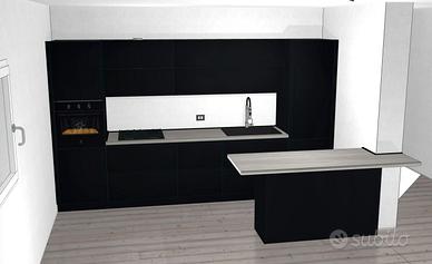 Modello Immagina Neck Plus laccata uv nera; lineare con penisola sagomata. Top in laminato abs 1H 4 cm effetto legno. Cucina compresa di elettrodomestici Electrolux: piano cottura a gas, lavastoviglie, forno e frigor. (non trattiamo Veneta cucine, Stosa, Scavolini, Mobilturi, Arredo3)