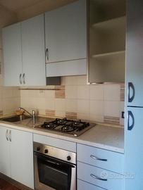 Cucina celeste con maniglie in acciaio, usata pochissimo;comprende stufa/forno e frigo ad incasso.