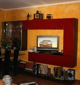 2) Mobile soggiorno con pensile e 2 vetrinette con vetro a specchio fumé e relative pedane in legno per appoggio libri o altro (in totale son 7pezzi) a € 350,00;