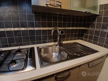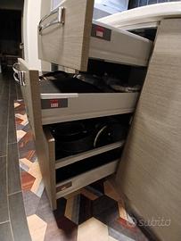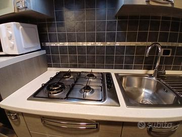 Vendesi splendida cucina firmata Lube, caratterizzata da un'estetica moderna e finiture di pregio. Perfetta per chi desidera un ambiente cucina elegante, compatto ma estremamente capiente. Caratteristiche Principali: Finitura: Ante in nobilitato con venatura orizzontale effetto legno (tonalità rovere grigio/fango), calde e facili da pulire. Elementi Pensili: Alternanza di ante piene e ante in vetro satinato con telaio in alluminio, per un effetto leggero e luminoso. Top e Alzatina: Piano di lavoro resistente in tonalità chiara coordinata. Dettagli di Design: Maniglie a ponte cromate dal design ergonomico e moderno. Elettrodomestici inclusi: Forno multifunzione ventilato in acciaio inox. Piano cottura a gas con 4 fuochi e griglie smaltate. Cappa aspirante a vista in acciaio inox, perfettamente integrata tra i pensili. Lavello a una vasca con scivolo in acciaio inox e miscelatore coordinato.