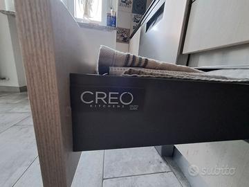 Cucina componibile bicolore comprensiva di elettrodomestici (lavastoviglie, lavatrice e frigorifero) e piano cottura a gas.