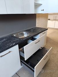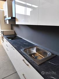 Cucina di fine serie bianca lucida mod. Peonia, scontata a più di metà prezzo! Si presenta lineare e misura 450 cm, ma con un'aggiunta di prezzo è possibile renderla angolare. Inoltre si può cambiare la disposizione degli elementi in base alle vostre esigenze, grazie ad un top in laminato INCLUSO nel prezzo ancora da tagliare e forare (a scelta tra diversi colori). I pensili sono maxi con un'altezza di 96 cm; la cucina è alta 240 cm. Le ante sono tutte bordate ABS, quindi non a spigolo vivo, ed hanno la chiusura rallentata grazie alle cerniere della Blum. Stesso discorso vale per i cassetti e cestoni. Gli schienali sono tutti rinforzati con uno sp. di 6 mm! Lo zoccolo è in alluminio, così come l'alzatina da 1x2 cm. Questo modello ha INCLUSI tutti gli elettrodomestici: - frigo 320 lt lordi ad incasso (è possibile trasformare la colonna in dispensa); - forno ventilato multifunzione; - microonde inox incassato; - piano cottura ad induzione da 60 cm nero (è possibile sostituirlo con un modello a gas) - cappa da 90 cm nera a "T" esterna; - lavastoviglie 13 coperti ad incasso; - lavello una vasca L59 cm inox. Siamo disponibili per trasporto e montaggio con prezzo da calcolare in base alla distanza ed al piano della casa. Possibilità di pagare con finanziamento. Andrea