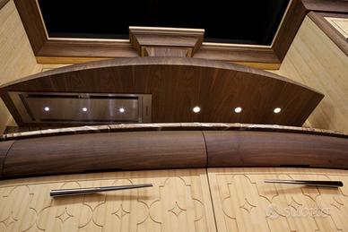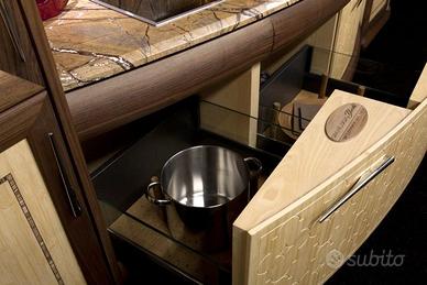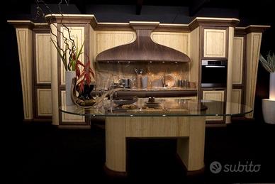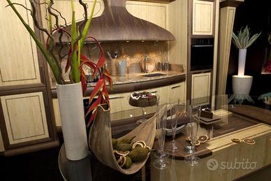 Pregiata cucina realizzata in listellare di legno rivestita in bambù naturale e noce canaletto. Cappa lavorata completamente a mano dalle abili mani dei nostri falegnami. Accessoristica, cerniere e guide scorrevoli di altissima qualità.
