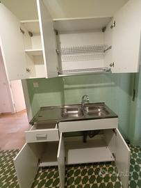 Vendo cucina della Mabel così composta: misure lavandino Largo 120 profondo 50 cm in corrispondenza pensili con scolapiatti e dei ripiano di appoggio hanno una larghezza di 120cm una altezza di 70 cm ed una profondità di 35cm, una base con due Sportelli largo 80cm, altezza 85 e profondità 50, in corrispondenza pensili a due ante altezza 70cm larghezza 80 cm e profondità 35cm, è compreso il rubinetto, ritiro a carico del cliente se concordati lo smotaggio a mio carico tot 170€