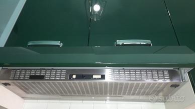 Lunghezza 3 metri verdi lucido, 5 pensili con scolapiatti e cappa sottopensile, lavabo, miscelatore, con 2 vasche e gocciatoia, pianocotura (Siemens) 5 fuochi, 4 cassetti. Senza lavastoviglia fregorifero e forno.