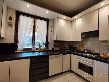 Vendo cucina Maistri bianca e antracite con piano cottura Bosch 4 fuochi, lavello angolare, completa di lavastoviglie Rex, forno, tavolo e panca.